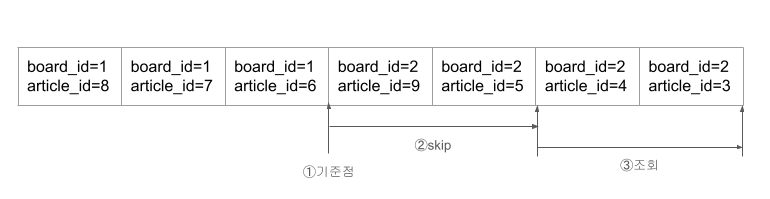 - (board_id, article_id)로 생성된 Secondary Index에서 article_id를 찾는다.