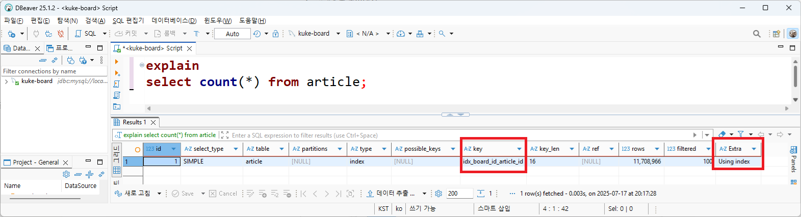 article_id를 이용해서 임의의 게시글을 조회하면 primary key에 자동으로 생성된 clustered index가 사용된 것을 확인할 수 있다.