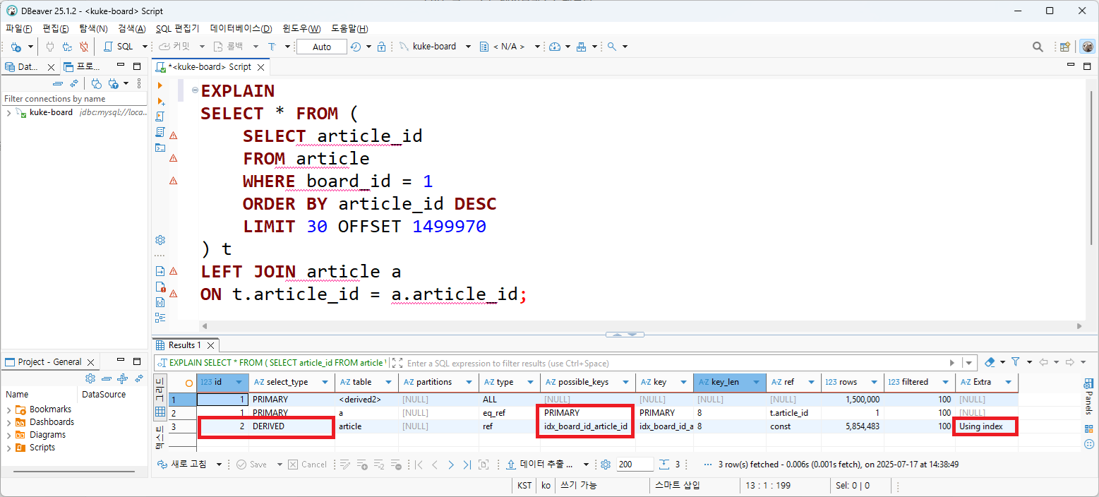 추출된 30건의 article_id에 대해서만 Clustered Index에 접근하면 된다. 30건의 article_id를 서브 쿼리 결과로 만들고, article 테이블과 join하면 0.119초에 데이터가 조회되었다. 실행 계획을 살펴보면 article_id 추출을 위한 sub query에서 파생 테이블이 생기지만(DERIVE), 이 과정에서 커버링 인덱스가 사용되었다. 작은 규모의 파생 테이블과 join하여 30건에 대해서만 clustered index(PK)에서 데이터를 가져오기 때문에 빠르게 조회가 빠르게 처리될 수 있었다.