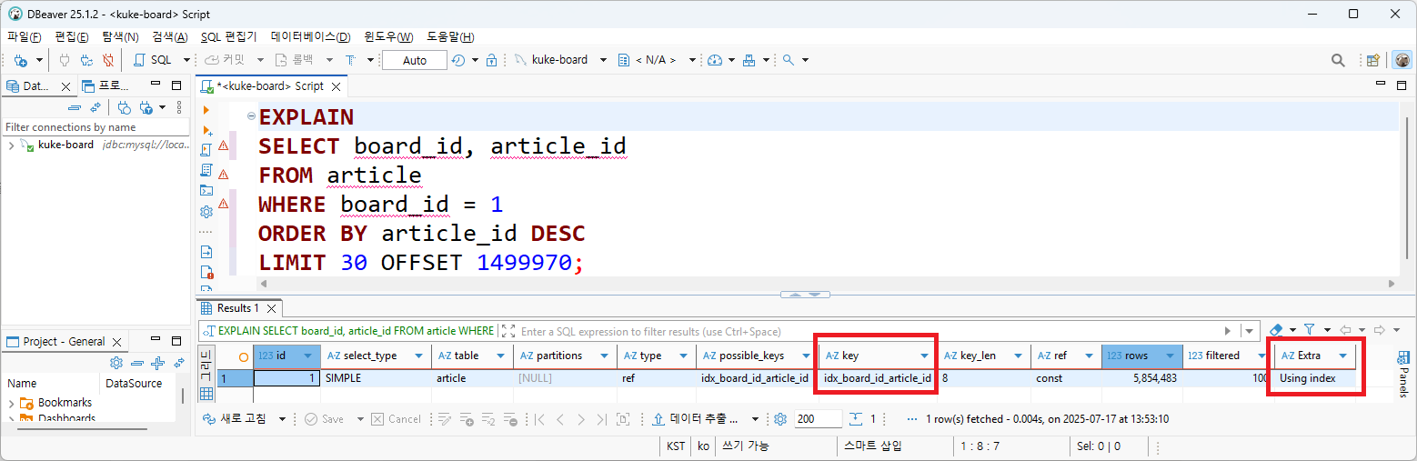 위의 쿼리문은 Clustered Index에 접근하는 과정 없이 Covering Index를 활용하여, Secondary Index에서만 board_id와 article_id를 추출한 것이다.